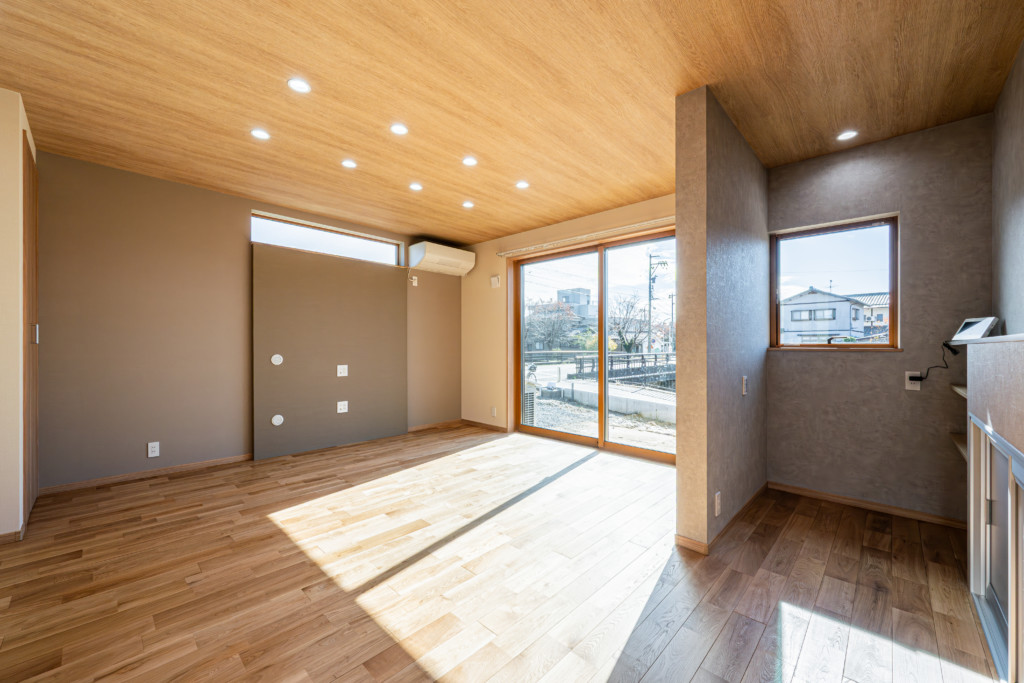 みんなが集うリビング 大きな窓 温かい日差し こだわりの無垢床 素足で歩いても快適